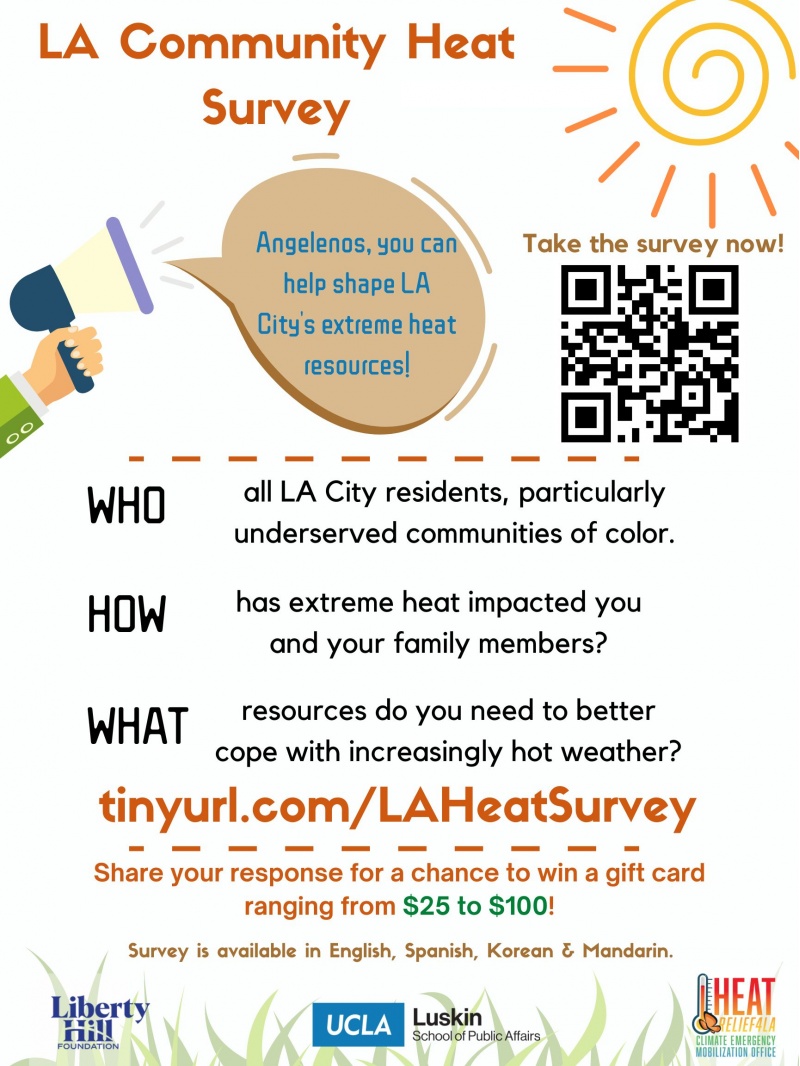 The City of LA's Climate Emergency Mobilization Office is working to develop a Heat Action Plan to prepare for hotter days in LA, especially for disadvantaged communities. Our group of UCLA researchers is helping CEMO to collect community opinions for the Plan. We believe that your neighborhood council representatives and community members represent highly vulnerable communities to heat in LA and we would like to include your perspectives in our report. If you wish to have a say in the City's plan, we would appreciate it if you could take and share this survey with your community as soon as possible (eg: in a newsletter, community-wide email, bulletin board, group chat, Facebook group etc). An English and Spanish flyer are attached to this email. Participants who fill out the survey will also be entered into a raffle to win a giftcard between $25-$100.